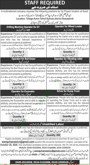 A well reputed company located in Village Karot Tehsil Kahuta, Rawalpindi is seeking candidates for the posts of Wheel Loader Operator, Drilling Machine Operator, Vibration Roller Operator, Bull Dozer Operator, Dump Truck Driver, Dumper Driver, Driver, HTV Driver, Excavator Operator, Labour.
