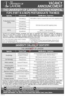 The University of Lahore Teaching Hospital, University of Lahore UOL, Pakistan is seeking candidates for the posts of Postgraduate Trainee, Professor, Associate Professor, Assistant Professor, Demonstrator, Doctor, Lady Doctor, Medical Specialist, Medical Consultant, Dermatology Consultant, Anaesthesia Consultant, Orthopaedic Consultant, Histopathology Consultant, Professor Oral Biology, Professor Oral Pathology, Professor Dental Material, Professor Dental Education, Professor Oral Surgery, Professor Maxillofacial Surgery, Professor Operative Dentistry, Professor Prosthodontics, Professor Oral Medicine, Professor Paediatric Dentistry.
